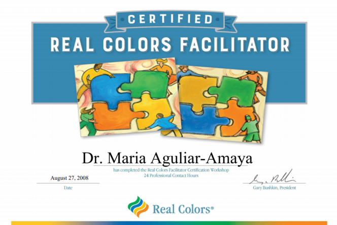 Dr. Aguilar-Amaya has been a Real Colors certified facilitator since 2008. She is a strong green / gold, which is an asset to the work she performs. As a Real Colors facilitator, she is able to assist your team or organization with identifying temperaments via a spectrum of colors (Green, Gold, Blue, and Orange). The value of bringing Real Colors to your team is that they are able to learn about themselves and their team members; providing the opportunity to maximize on the team's synergy. You'll be glad you brought Real Colors to your team.